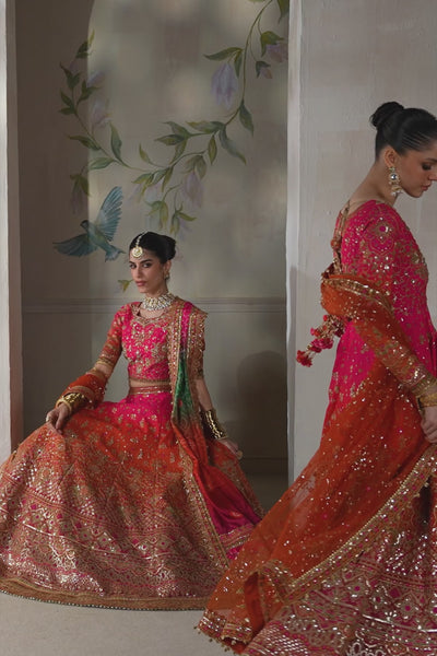 The choli or yoke features intricate handwork of dabka, zari, and sequins, complemented by a blend of vibrant gradient and dual dupattas for an opulent finish.