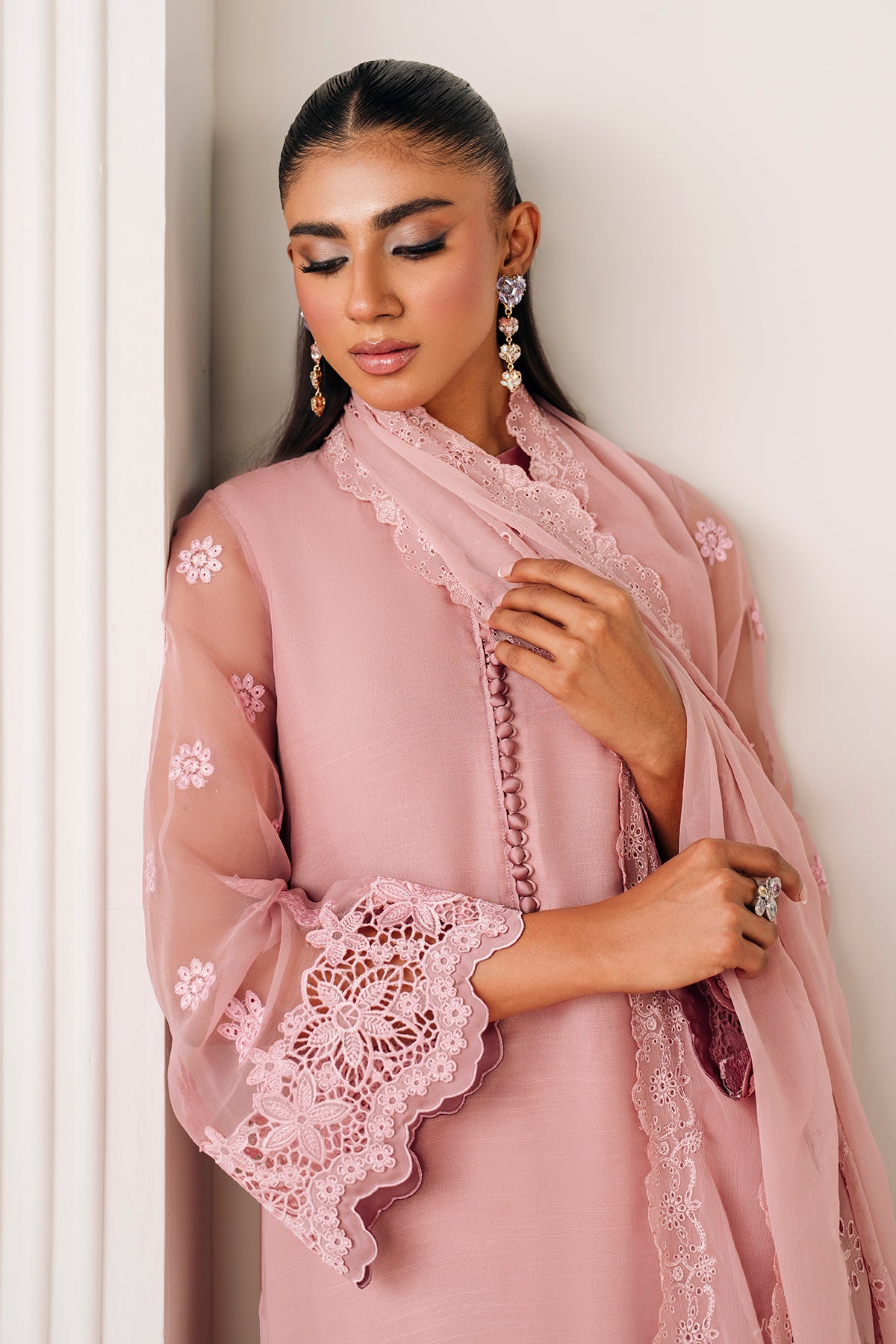 The loose-fitted long shirt features exquisite embroidered sleeves with scalloped fabric detailed edges. The ban neckline has open slit which is adorned with fabric-covered buttons in loops down the row.
