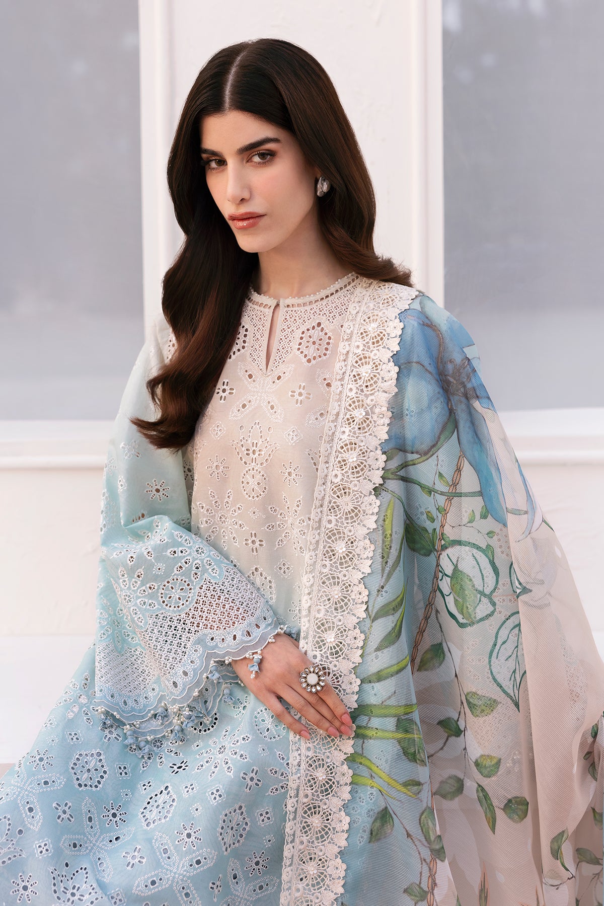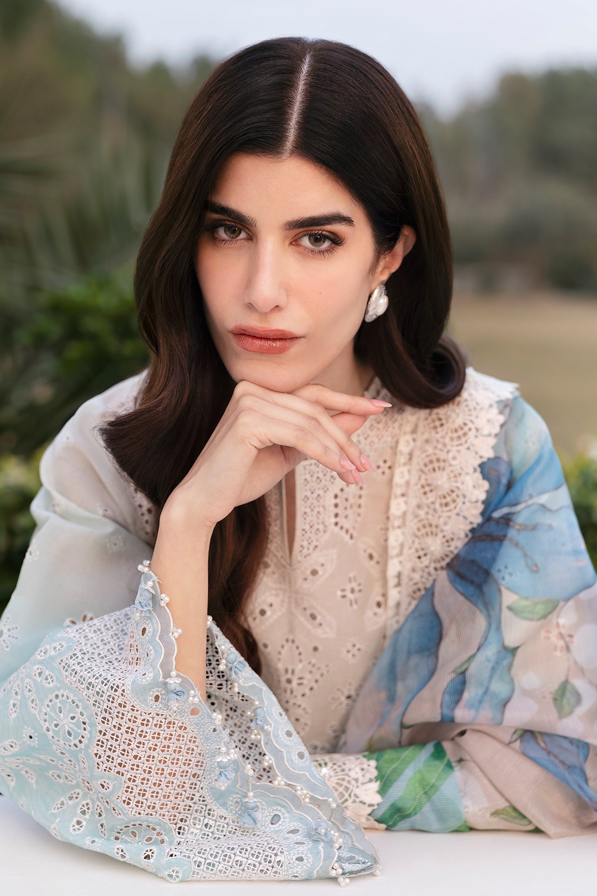 This luxurious unstitched ensemble showcases an embroidered digital printed lawn front, complemented by a printed lawn back and embroidered sleeves for a complete, refined look. The outfit is adorned with intricate organza embroidery, including a beautifully crafted neckline patch and multiple detailed borders for the front, back, sleeves, and trouser. A digital printed cotton net dupatta, enhanced with an embroidered organza border, adds a graceful finish. Paired with a digital printed cotton trouser and matching embroidered border, this ensemble is perfect for making a stylish statement at festive or formal events.