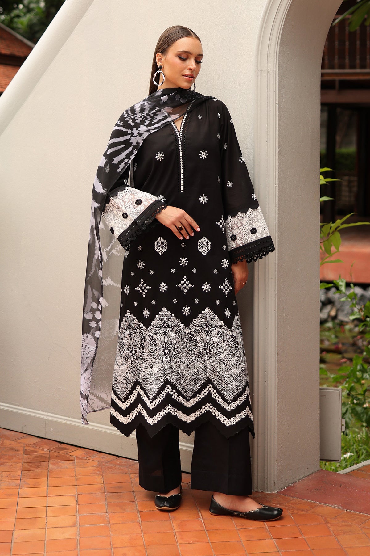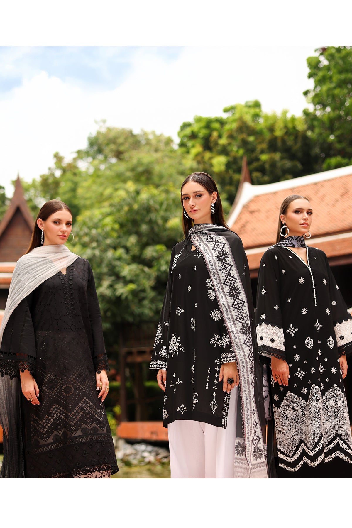 An exquisite unstitched set including an embroidered lawn front, dyed lawn back, and intricate organza front border and neckline patch. The embroidered lawn sleeves with organza borders and multiple motifs offer detailed elegance. Paired with a digitally printed chiffon dupatta and dyed cotton trouser fabric, this set provides endless options for custom tailoring and style.