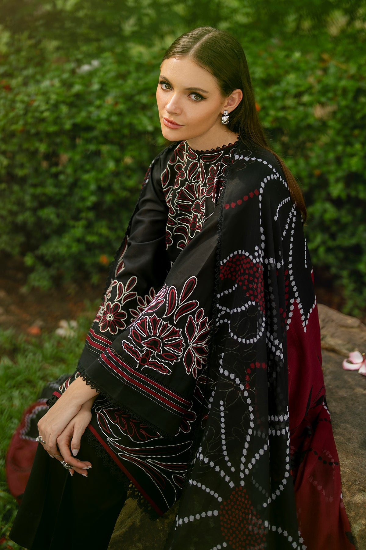 An exquisite unstitched suit set featuring embroidered lawn front, enhanced with an organza neckline patch and detailed borders. The embroidered sleeves and matching organza sleeve borders add a graceful finish. A digitally printed chiffon dupatta with an embroidered organza border pairs beautifully with the dyed cotton trouser, offering endless styling possibilities.