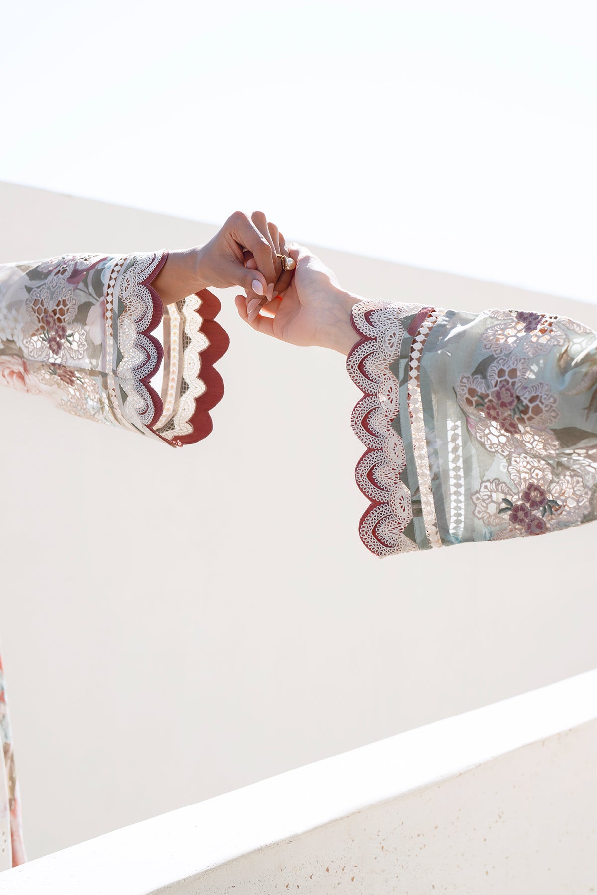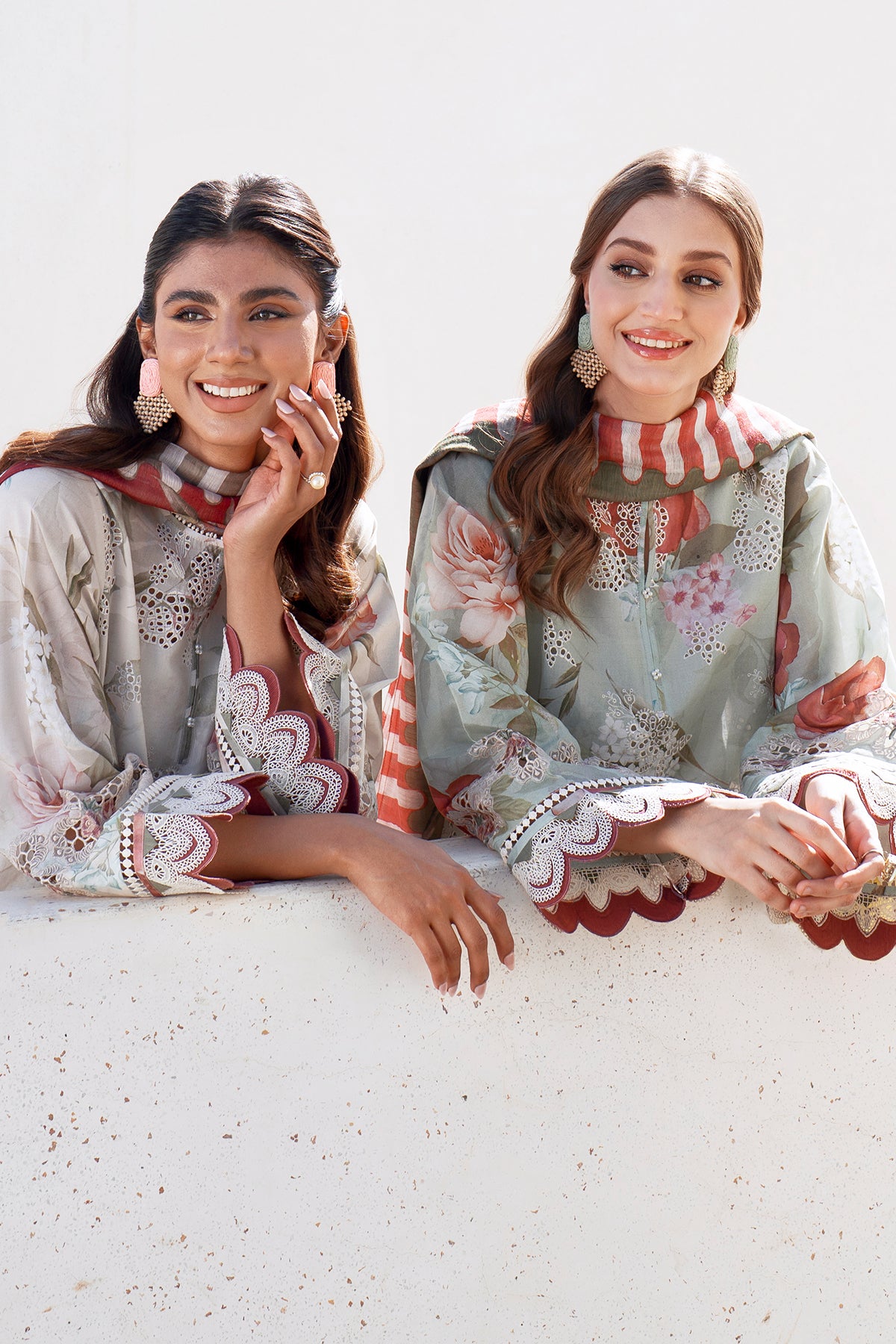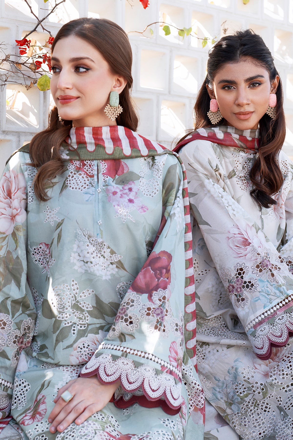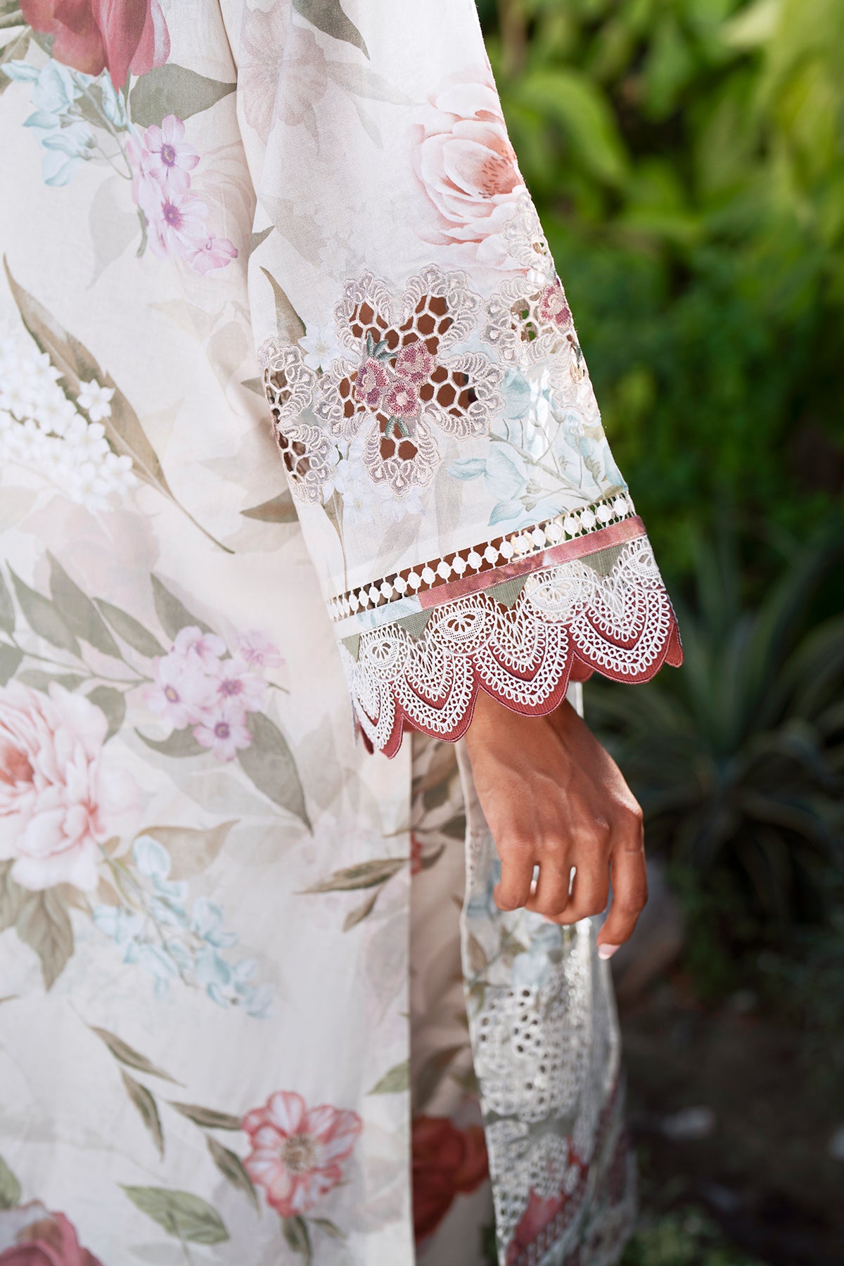 Crafted in a delicate blush palette, this digital printed lawn ensemble exudes grace. The shirt is adorned with subtle embroidered detailing along the neckline and borders, harmoniously blending with vibrant floral prints that give the piece a fresh appeal. The digitally printed lawn trouser complements the prints seamlessly. A beautiful printed munaar dupatta completes the look.