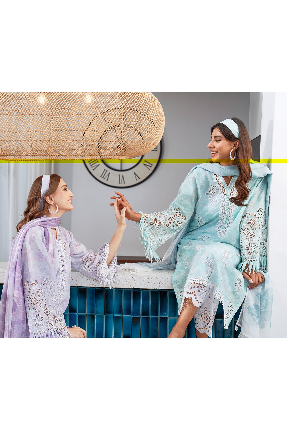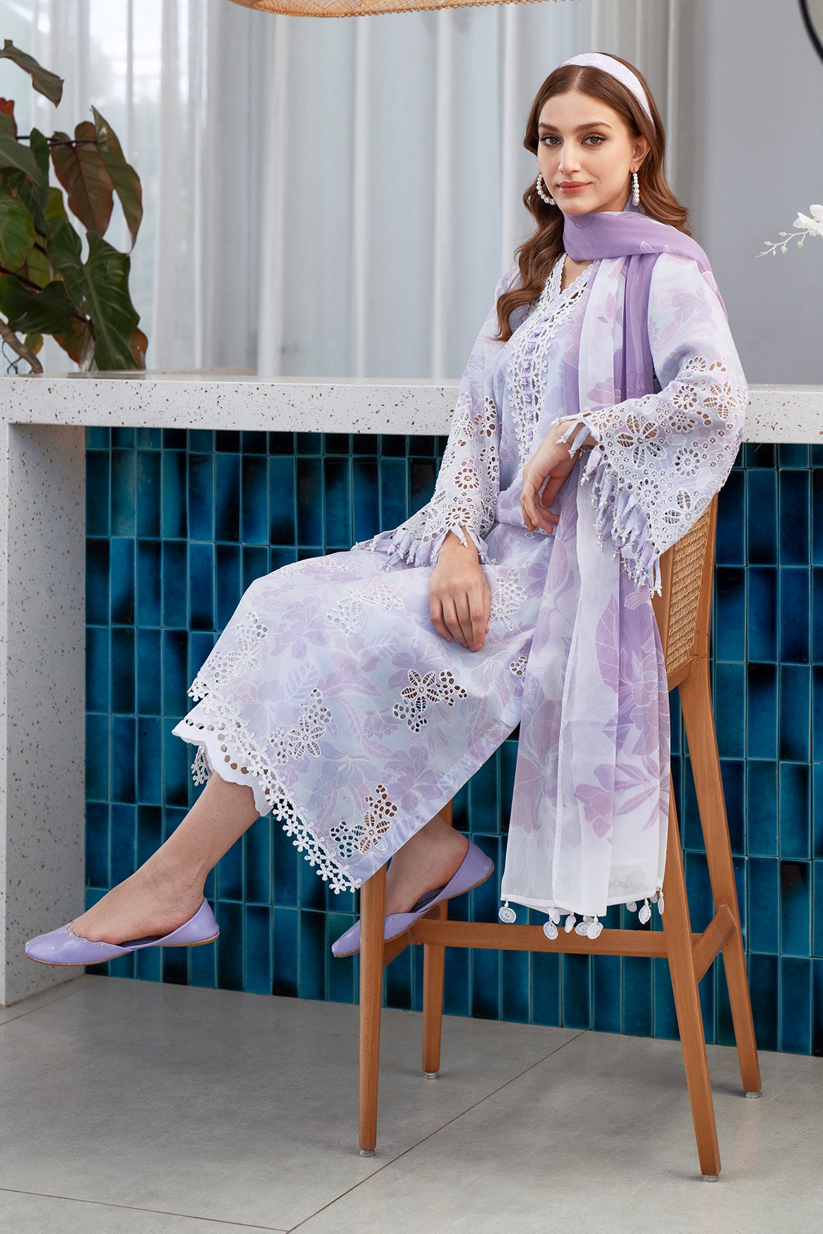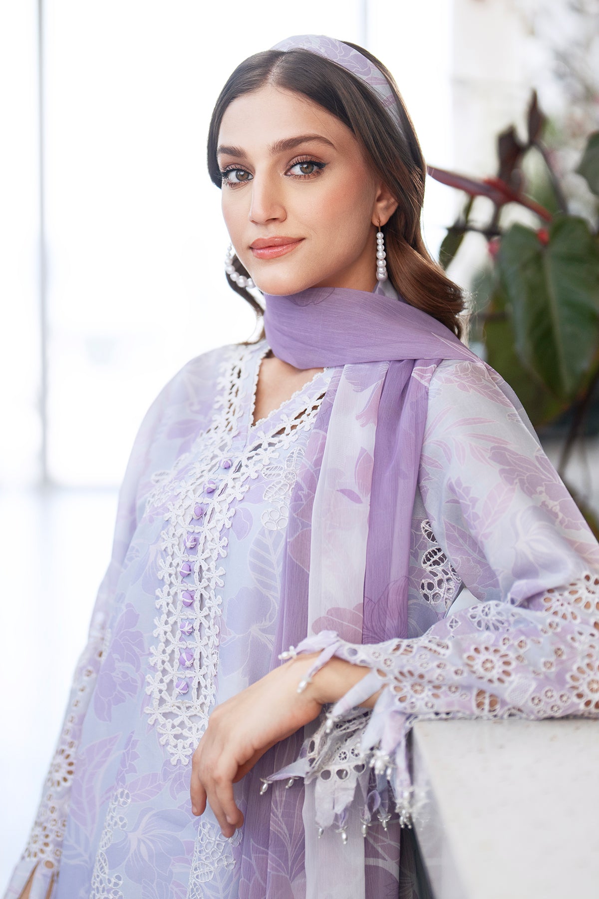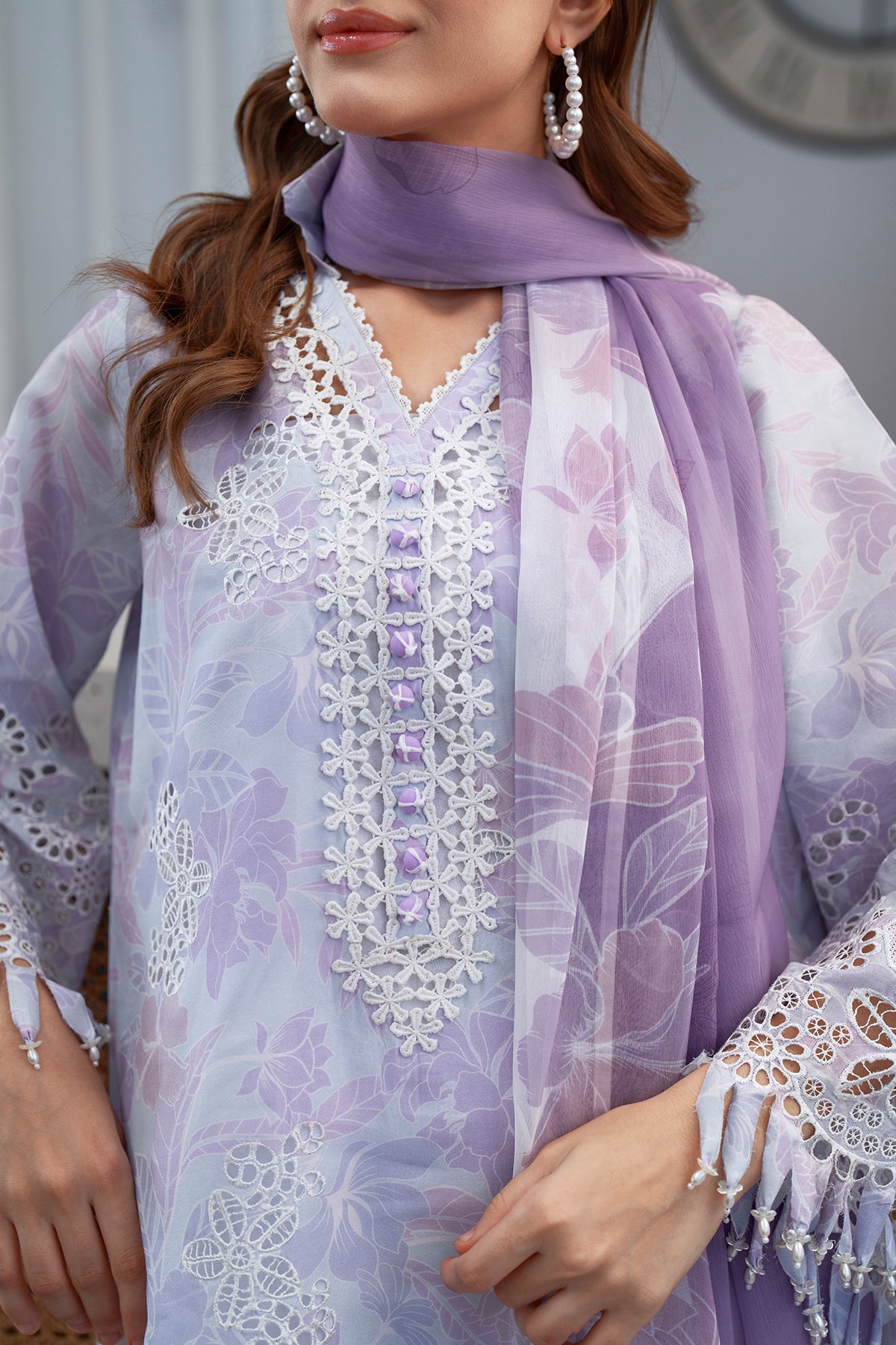 This stylish outfit features an embroidered digital printed lawn front, back, and sleeves, paired with a beautifully detailed embroidered cotton trouser. The look is completed with a digital printed silk dupatta, accented by delicate organza motifs, and finished with an embroidered neckline patch and front border—perfect for any festive or semi-formal occasion.