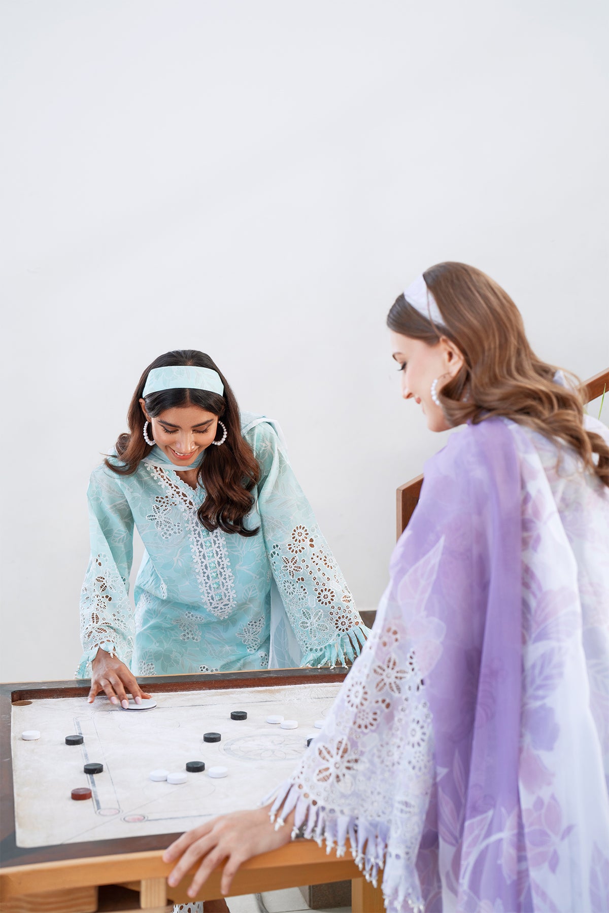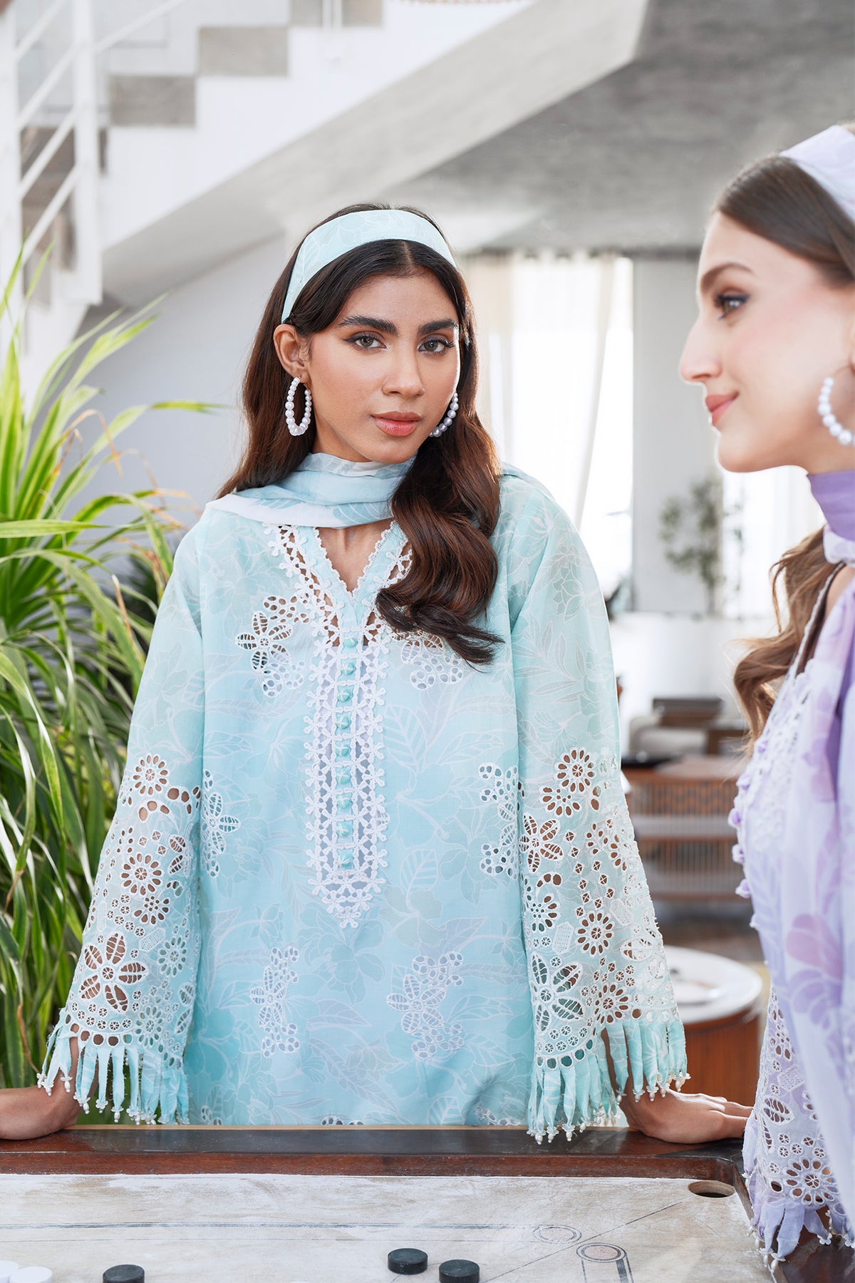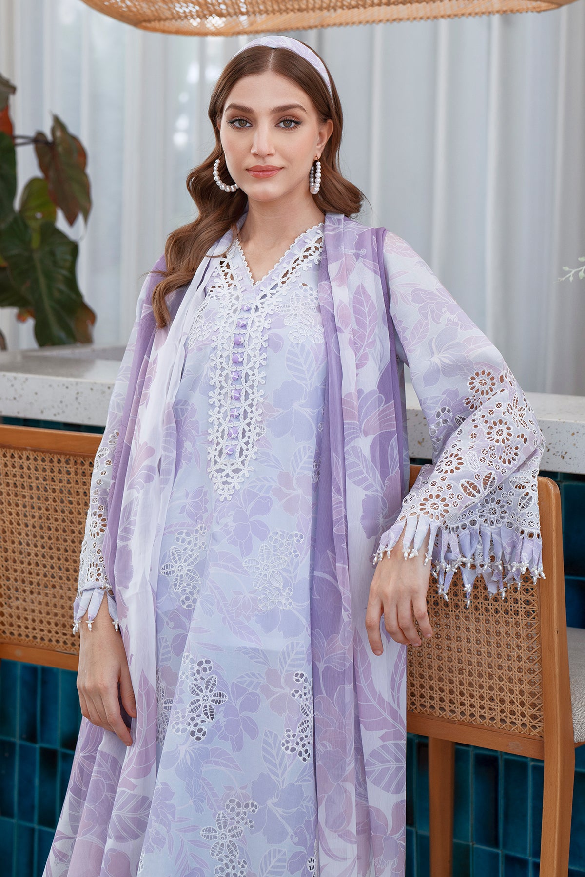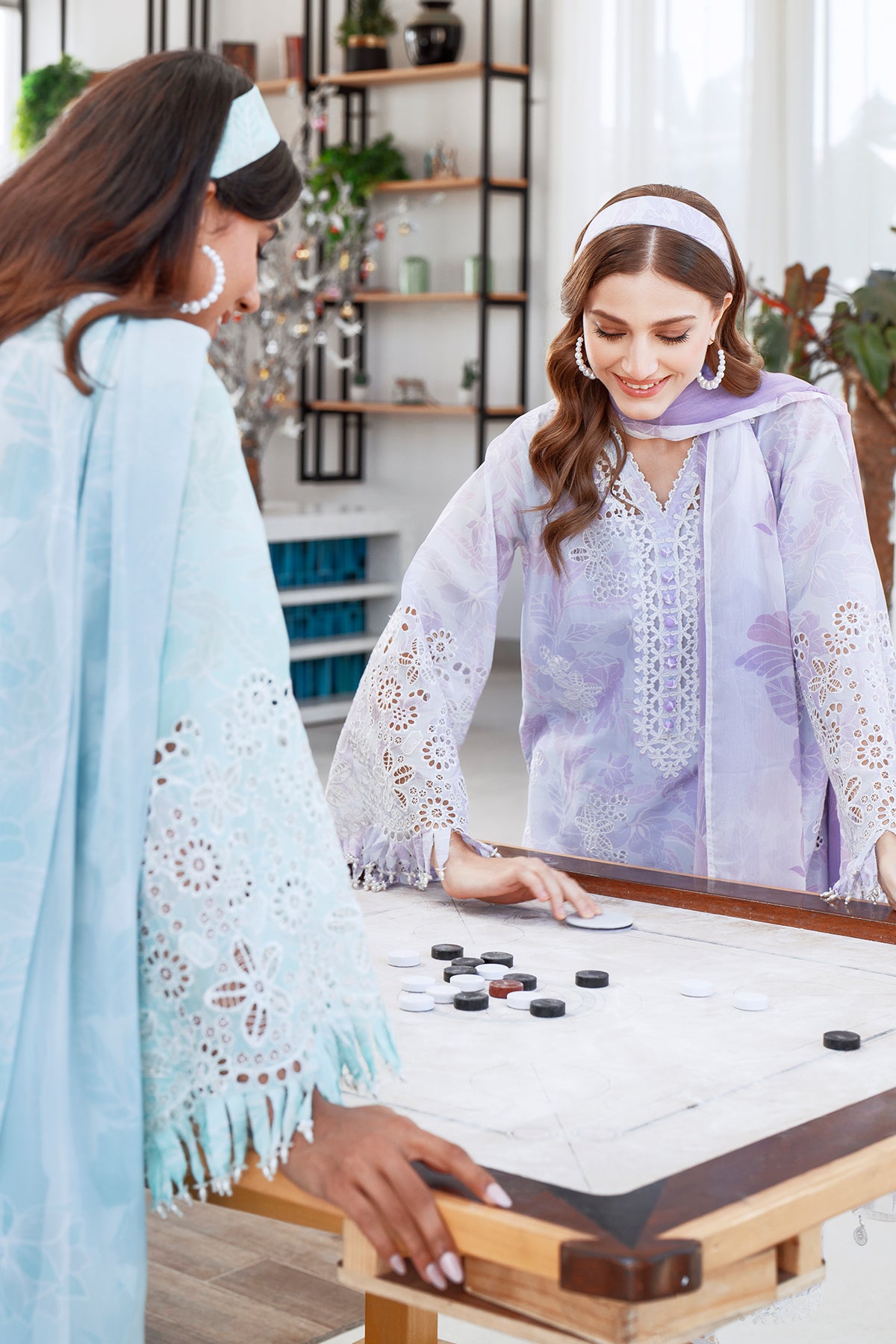 This stylish outfit features an embroidered digital printed lawn front, back, and sleeves, paired with a beautifully detailed embroidered cotton trouser. The look is completed with a digital printed silk dupatta, accented by delicate organza motifs, and finished with an embroidered neckline patch and front border—perfect for any festive or semi-formal occasion.