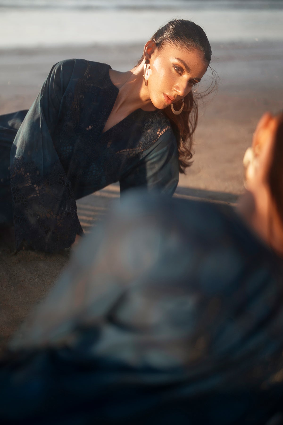 These sets blend traditional aesthetics with modern design. It features lawn fabric of darker shade with detailed embroidery on the neckline, sleeves & front border. The look is completed by a digital printed silk dupatta and matching printed trouser.